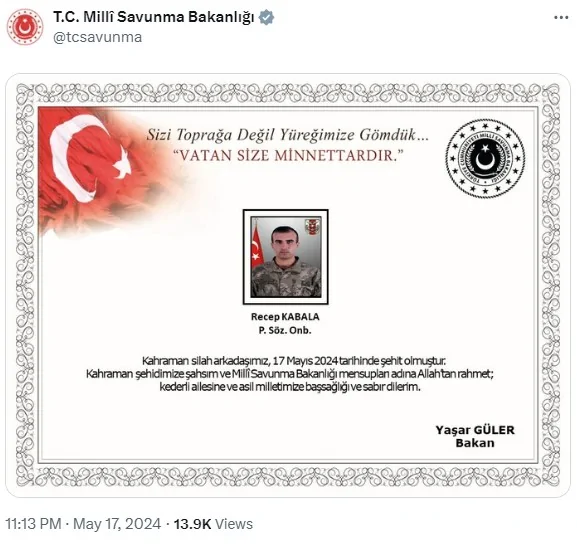 “Pençe-Kaplan operasyonu bölgesinde, silah kazası sonucu kahraman silah arkadaşımız P. Söz. Onb. Recep Kabala şehit olmuştur. Bizleri derin bir acı ve üzüntüye boğan bu olayda hayatını kaybeden aziz şehidimize Allah’tan rahmet, kederli ailesine, Türk Silahlı Kuvvetleri ile asil milletimize başsağlığı ve sabır dileriz.”