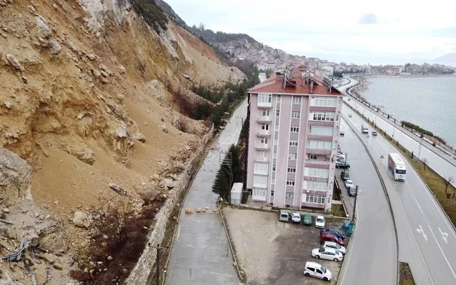 İnceleme sonrası heyelan ve taş düşme riskine karşı 64 daireli 4 binanın tahliyesine karar verildi.