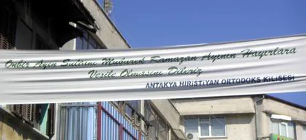 Antakya Hıristiyan Ortodoks Kilisesi Cemaati, Müslümanlar'ın mübarek Ramazan ayını pankartla kutladı. Hıristiyan Ortodoks Kilisesi, Ramazan ayının başlaması dolayısıyla Saray Caddesi'ne, "Onbir ayın sultanı mübarek Ramazan ayının hayırlara vesile olmasını dileriz" yazılı bir pankart astı.