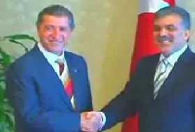 Gül ve Toptan, bir basın mensubunun ricası üzerine ayağa kalktı ve tokalaşarak poz verdi.