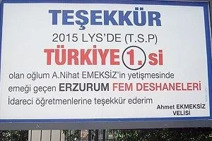 LYS Türkiye birincisi Ahmet Nihat Emeksiz'in babası Ahmet Emeksiz, oğlunun yetişmesinde ciddi katkısı olan FEM Dershaneleri Erzurum Şubesi'ne teşekkür için bilboardlara ilan verdi.