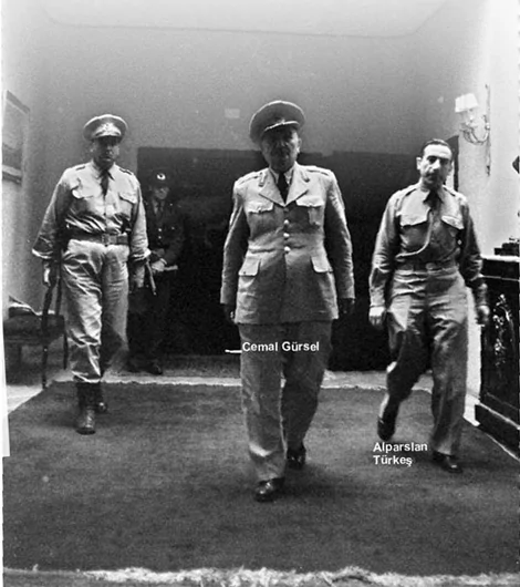 Hemen arkasında daha sonra yollarının ayrılacağı, ihtilalin güçlü Albayı Alpaslan Türkeş var.