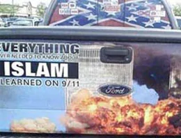 Aşırı muhafazakar bir Hıristiyan olan Douglas'ın aracının arkasında, 11 Eylül'de saldırılarda yerle bir olan ikiz kuleler, ateş içinde görülüyor. Üzerinde ise, "İslam ile ilgili öğrenmem gereken her şeyi, 9/11'de öğrendim" yazılı..