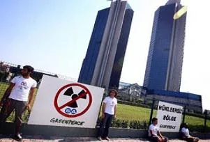 Diğer bir grup eylemci ise Sabancı Center'ın bahçe çitlerine ''Go solar'', ''nükleersiz bölge'' yazılı dövizleri zincirle bağladı.