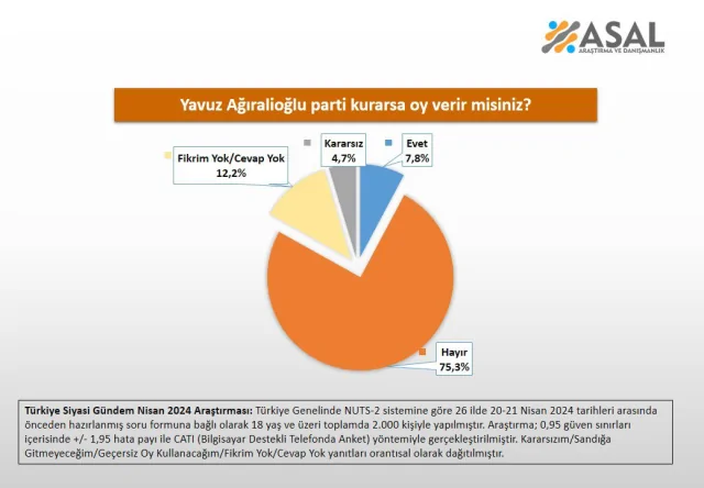 Ankete 2 bin kişi katılmış ve yüzde 4.7’si kararsız olduğunu beyan etmiş.Bu sonuçlar, Ağıralioğlu’nun yeni parti kurma planlarını yeniden gözden geçirmesine neden olabilir. Özellikle de kamuoyunun bu denli büyük bir çoğunluğunun Ağıralioğlu’na destek vermeye niyetli olmaması, siyasi arenada ciddi bir zorluk olarak değerlendirilebilir. Ayrıca, anketteki kararsız kesimin de belirgin bir oranda olduğu düşünülürse, Ağıralioğlu’nun yeni parti kurma girişimindeki başarısı için önemli bir engel daha ortaya çıkıyor. Bu durum, siyasi sahnedeki dengeleri değiştirebilecek potansiyele sahip olabilir.